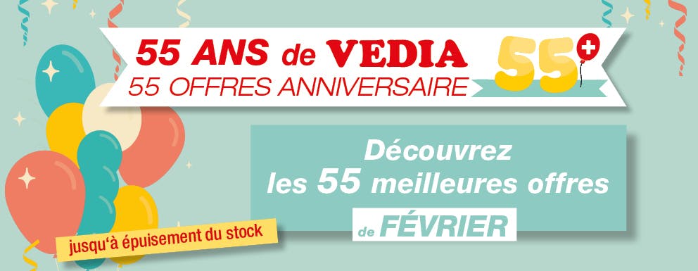 Depuis 55 ans, Vedia vous accompagne au quotidien avec des produits fiables et de qualité. À l’occasion de ce jubilé, découvrez une sélection de nos meilleurs articles, soigneusement choisis dans différentes catégories. Des indispensables qui font le succès de Vedia depuis des générations.