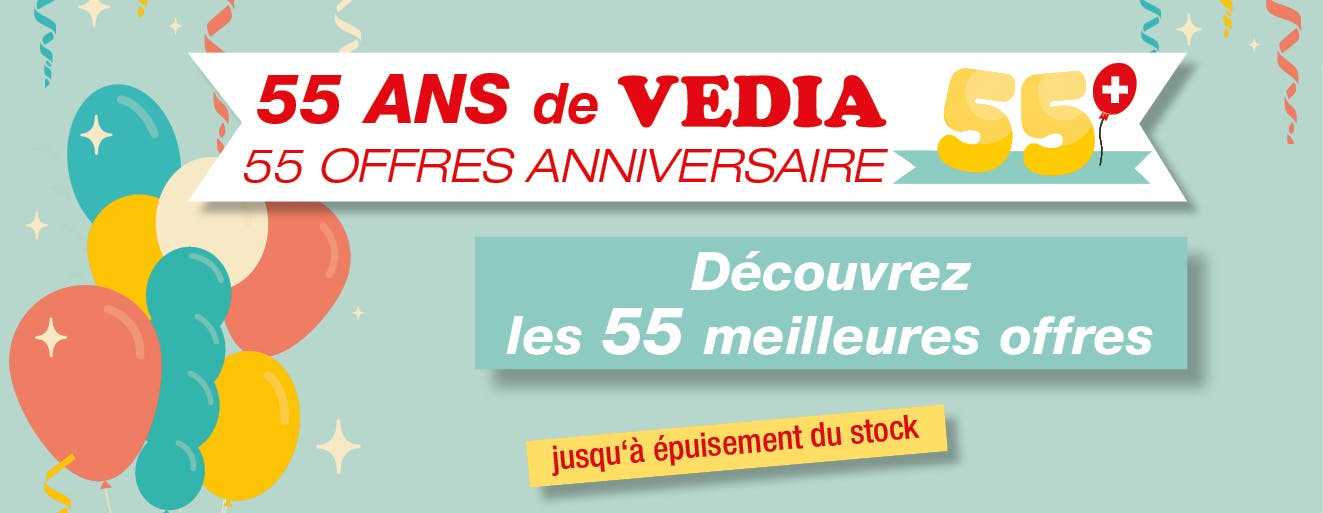 Depuis 55 ans, Vedia vous accompagne au quotidien avec des produits fiables et de qualité. À l’occasion de ce jubilé, découvrez une sélection de nos meilleurs articles, soigneusement choisis dans différentes catégories. Des indispensables qui font le succès de Vedia depuis des générations.