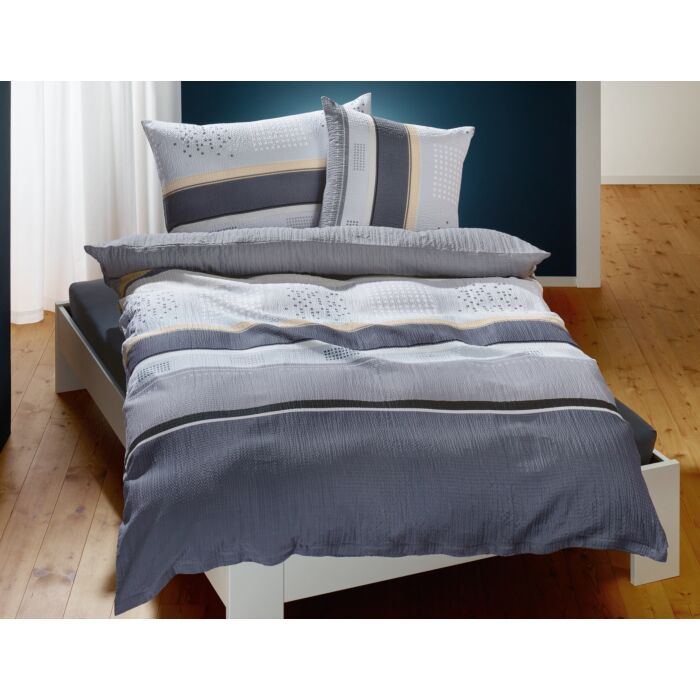Bettwäsche Streifen und Punkte, Satin-Seersucker, grau